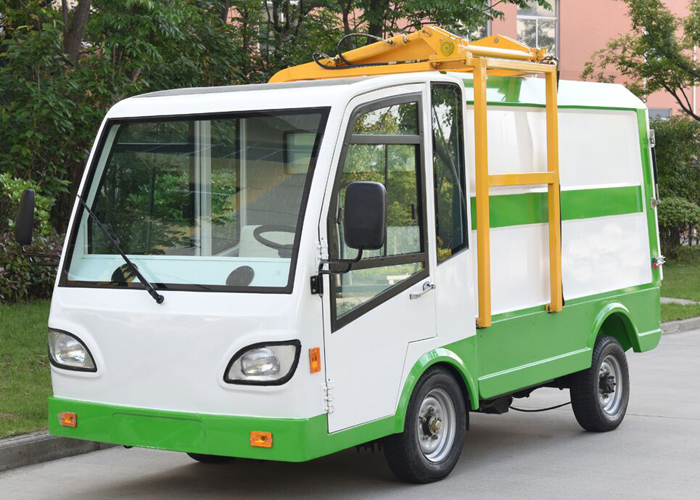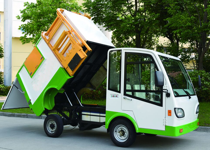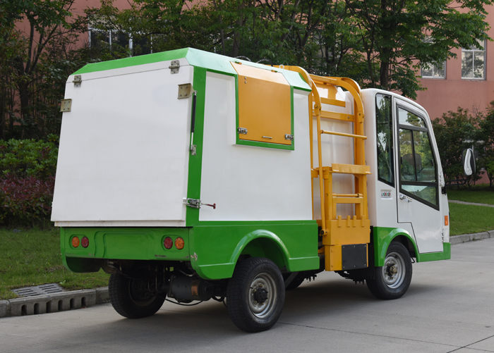 四輪純電動翻桶車采用垃圾箱體與后門封條密封,可保證各種生活垃圾處于密封狀態。連桿滑塊提升及自鎖壓桶機構,垃圾注入口蓋板與垃圾桶提升為連動機構,垃圾桶自動提升自動傾倒。